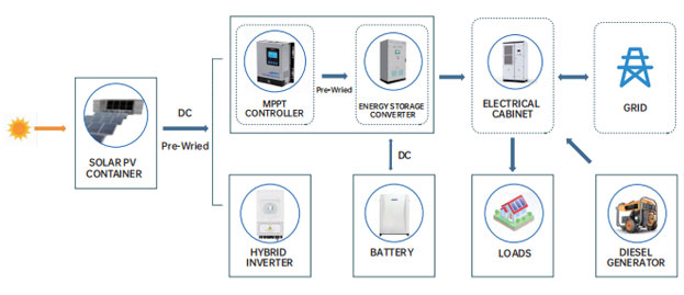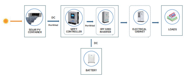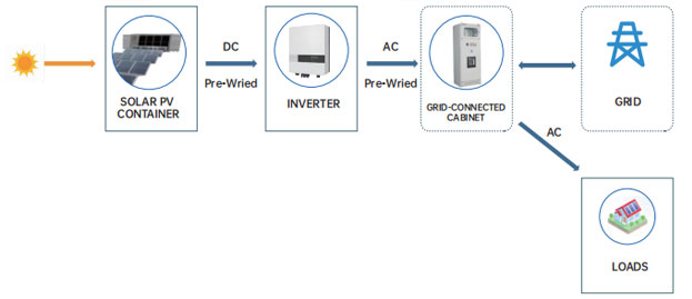 De door de zonnemodule gegenereerde gelijkstroom wordt door de omvormer omgezet in wisselstroom, die vervolgens aan de belasting wordt geleverd en op het elektriciteitsnet wordt aangesloten. Op deze manier kan, terwijl aan de huishoudelijke belasting wordt voldaan, overtollige elektriciteit ook aan het elektriciteitsnet worden verkocht.